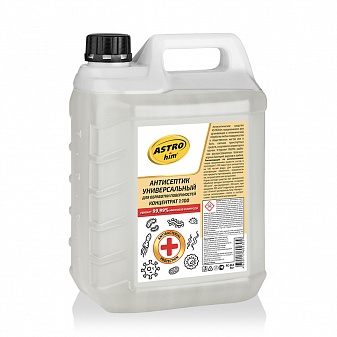 Антисептическое средство ASTROhim предназначено для дезинфекции и гигиенической обработки любых поверхностей в общественных местах или в быту, салонов транспортных средств, спортивного инвентаря и прочих. Устраняет 99,99% наиболее распространенных болезнетворных бактерий, вирусов и грибов.